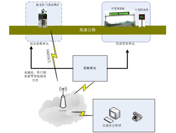 可依托高速公路上已安裝的可變限速標(biāo)志,根據(jù)不同路段檢測的能見距離,實時控制各限速標(biāo)志的限速值,這樣系統(tǒng)不但可及時提醒駕駛員注意前方大霧,還可向駕駛員安全速度。